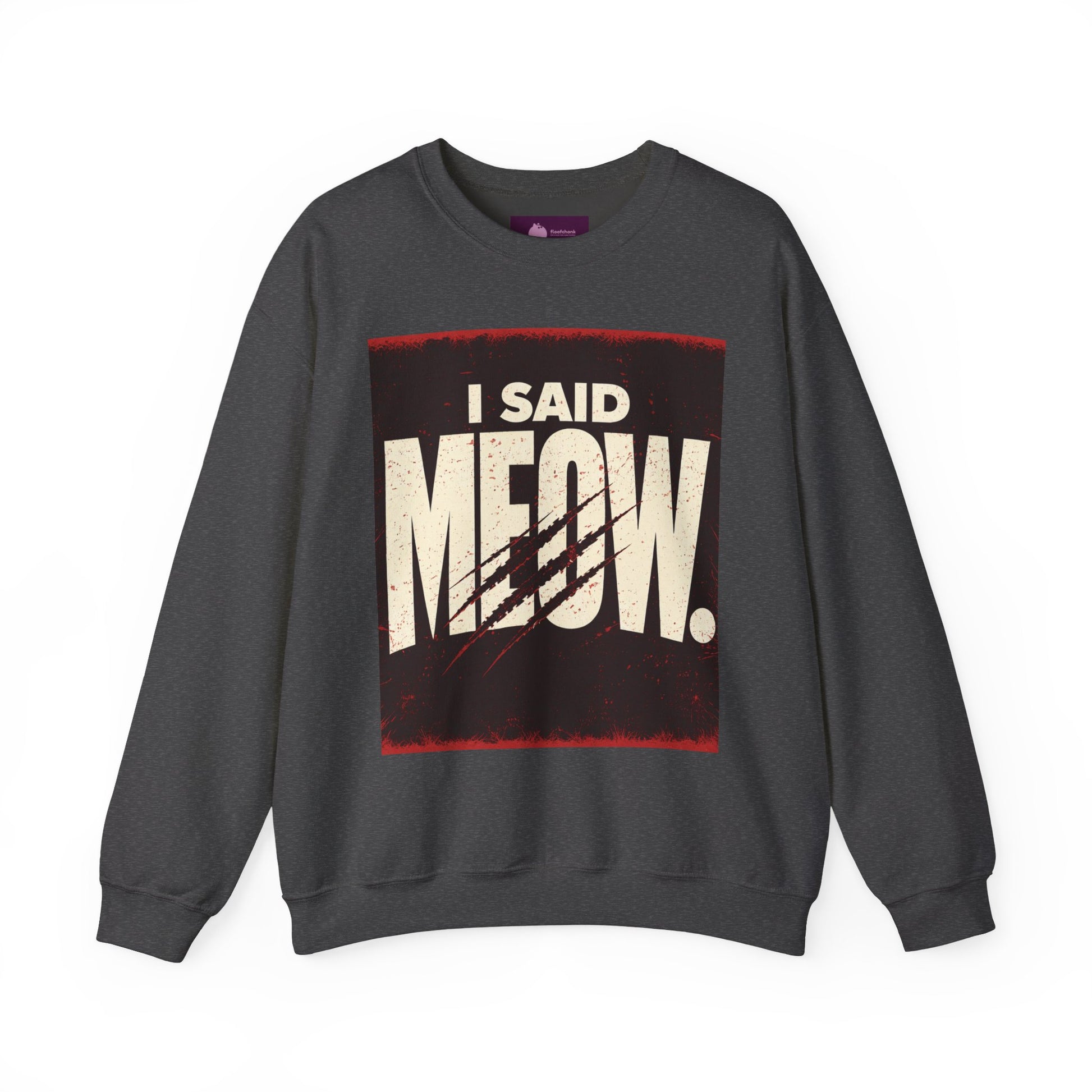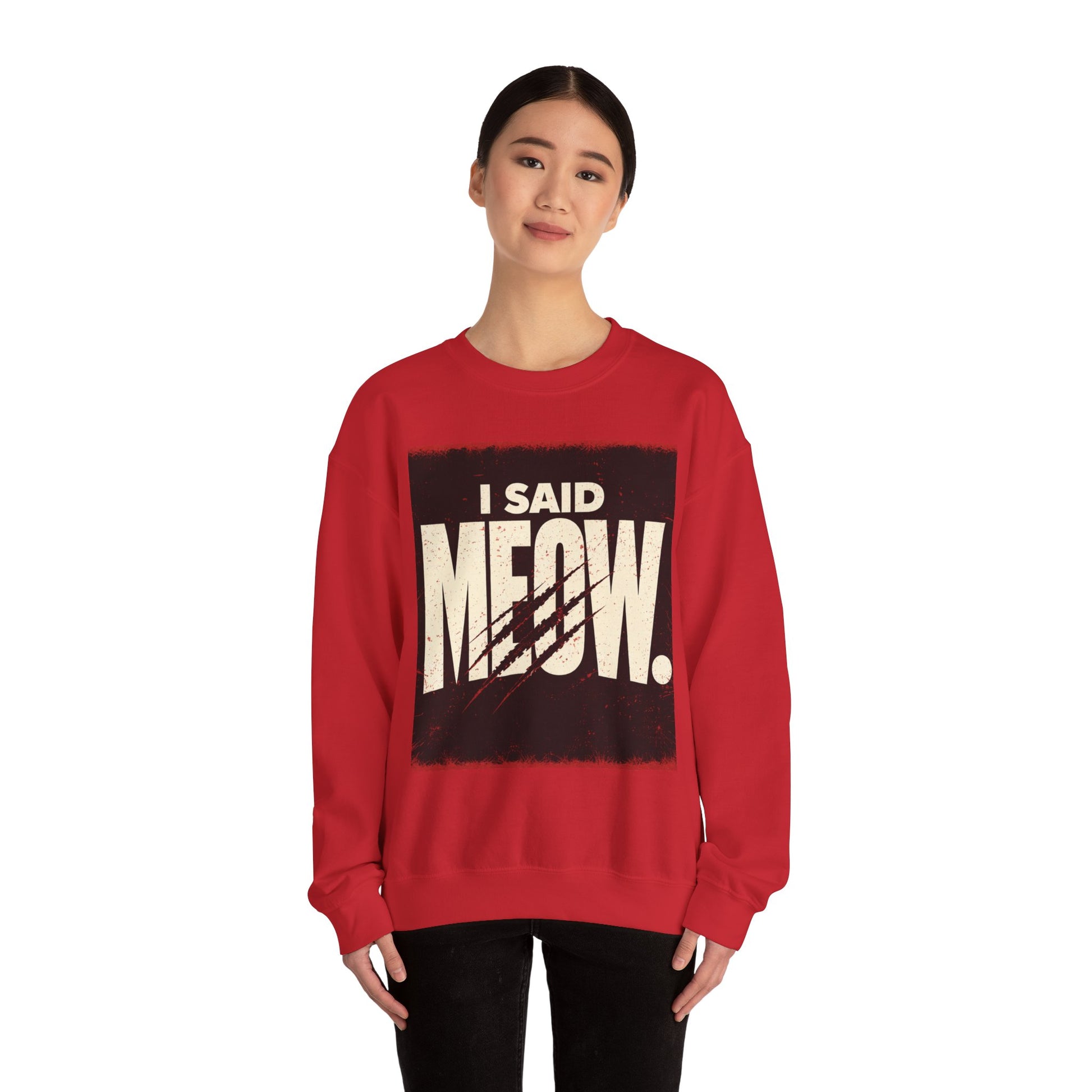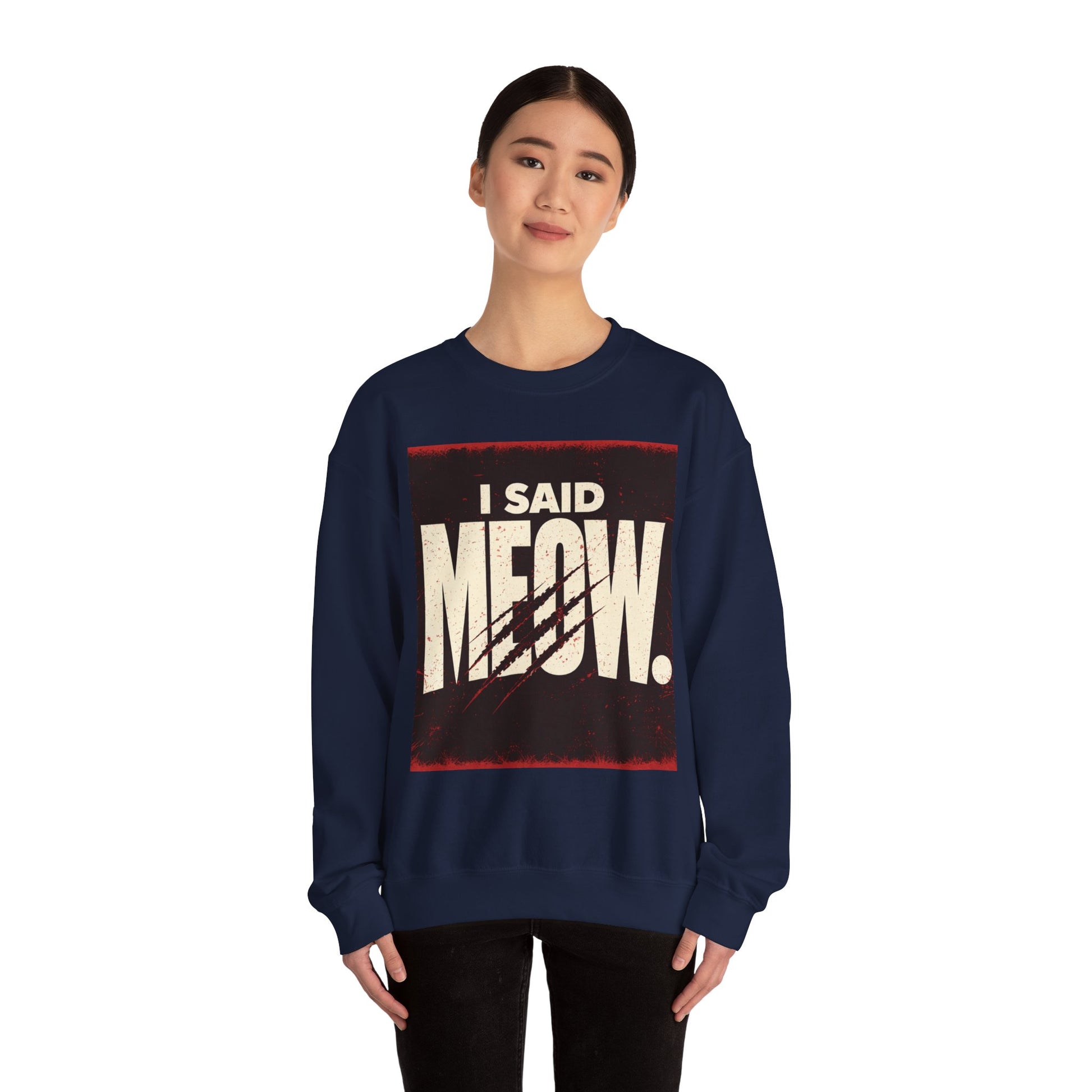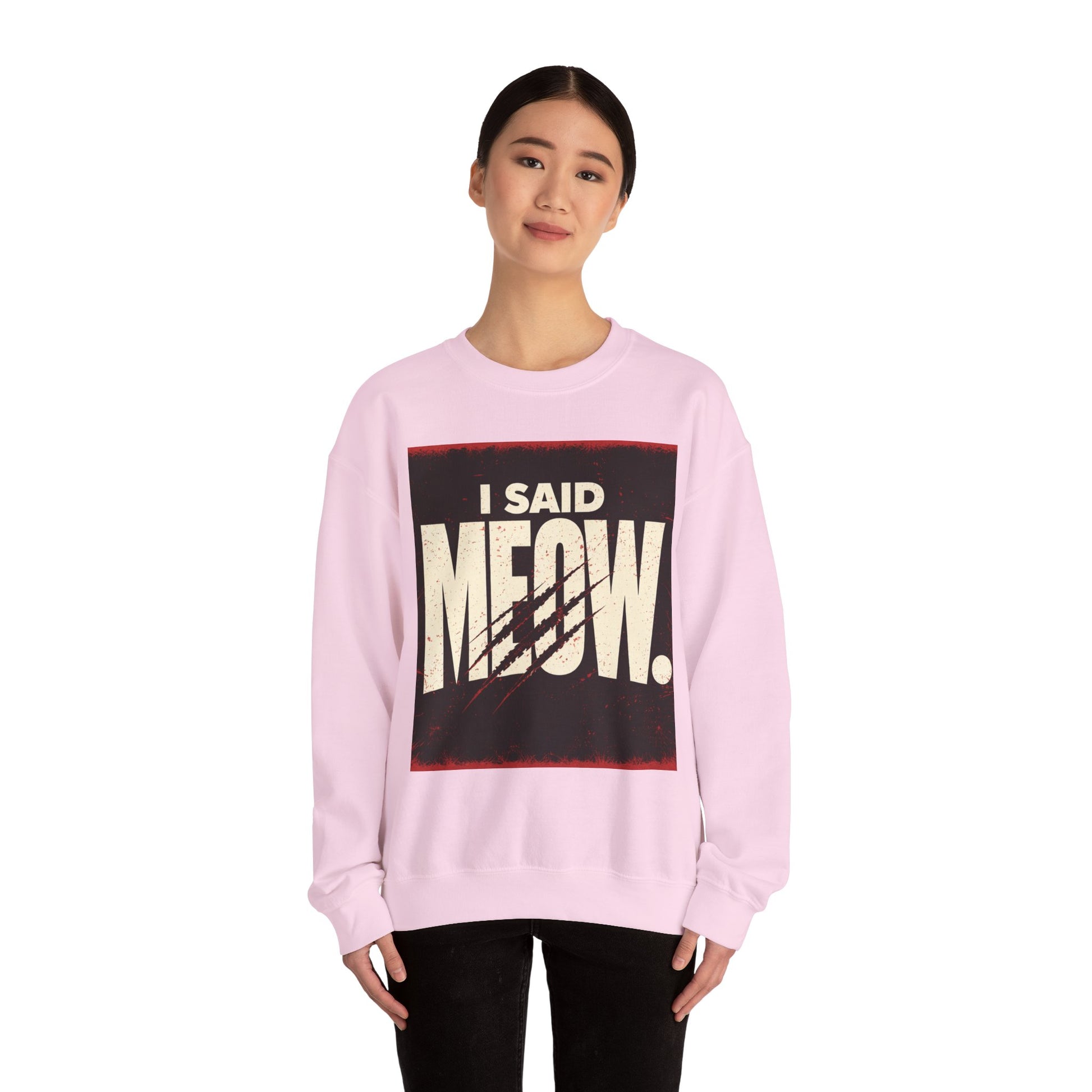 Speak your mind—feline style. This cozy sweatshirt features bold, dimensional typography that brings "I Said Meow" to life with a sleek shadow effect. The 3D text design pops against the soft fabric, making it the perfect piece for cat lovers who aren't afraid to make a statement. Comfortable enough for everyday wear, eye-catching enough to turn heads. Meow means meow.